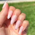 A sheer pink that makes a soft, feminine statement in a long almond shape.