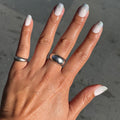 A perfect gradient of silver glitter on a neutral Bunny Slope base in a short squoval shape.