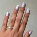 An icy lavender manicure with pretty petal designs across each nail in an extra short round shape.