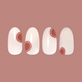 A neutral mani accented with fine line swirls and burnt orange circles in a medium oval shape.