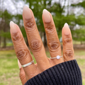 Find your best fit. Push back cuticles and gently buff nails. Wipe with prep paid. Apply glue to the press-on nail and the natural nail. Slide the press-on nail onto the natural nail and hold for 30 seconds. Repeat with remaining nails.