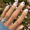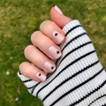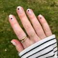 A neutral mani accented by 3D puffy dark hearts in an extra short squoval shape.