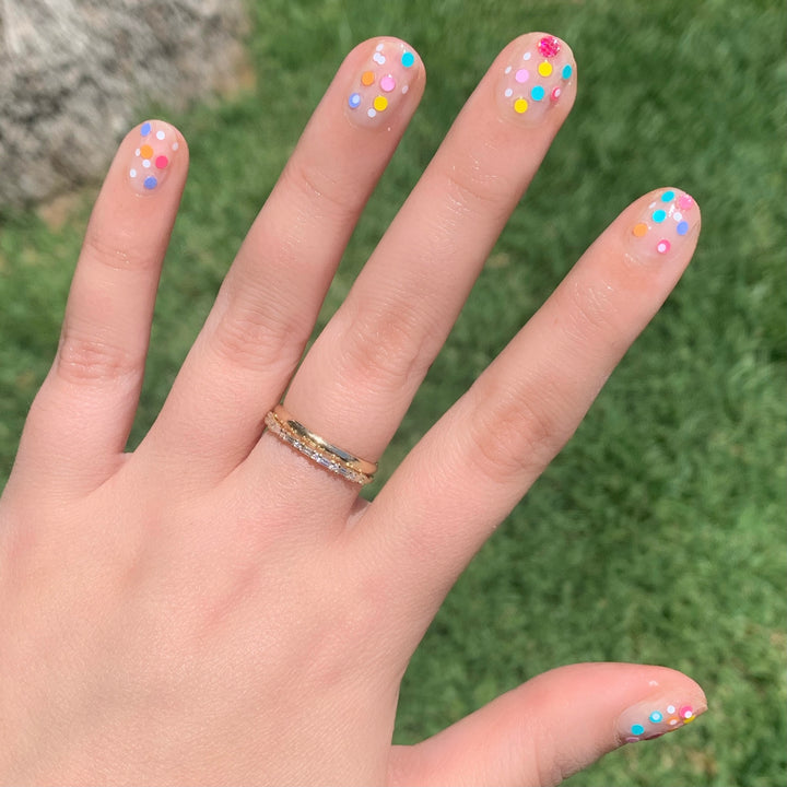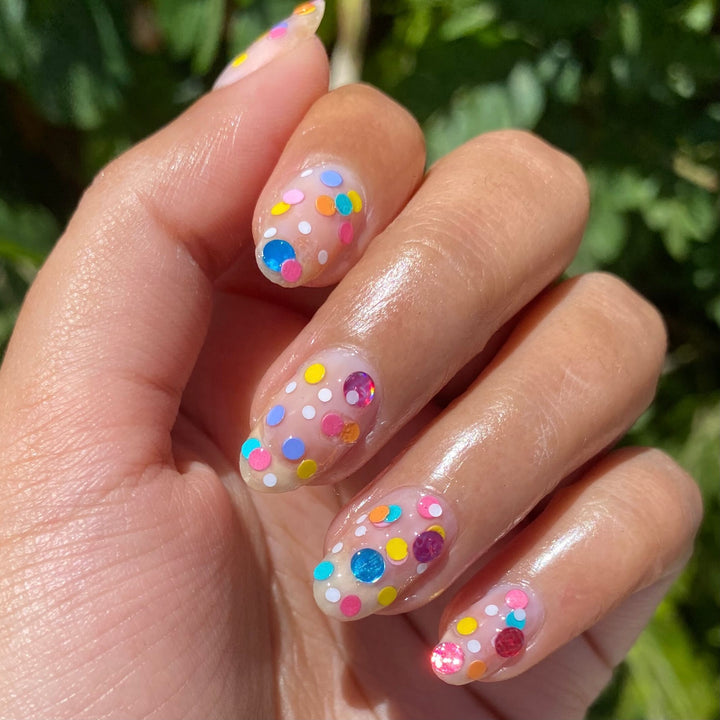 A rainbow confetti polish in a clear base to add a little sweetness and fun to all your nails.